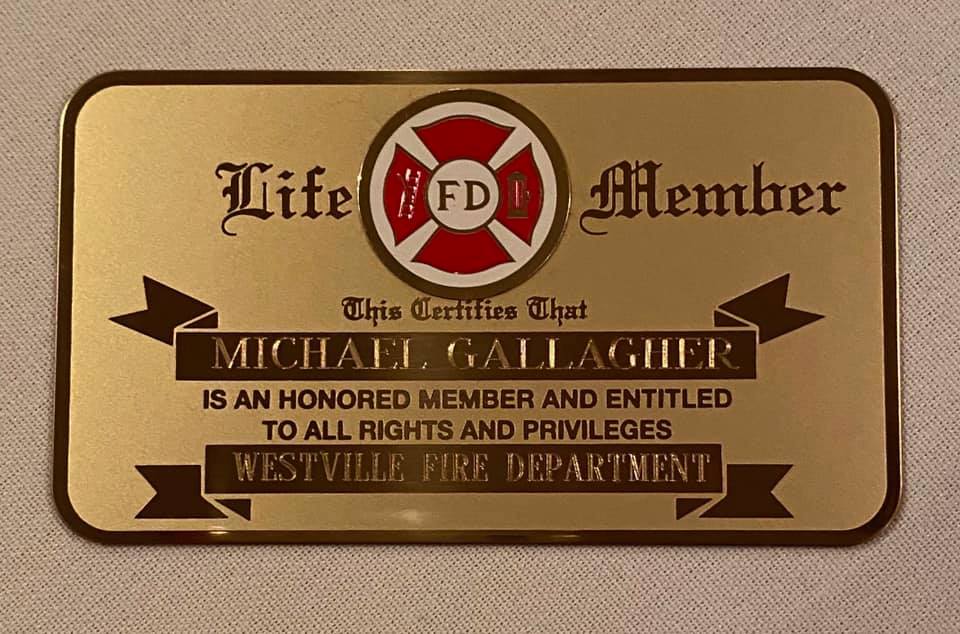 At our November business meeting, the department voted unanimously to give Chief Michael Gallagher an honorary Life Membership to the department. At our Christmas party last night, President Bruce Nordaby and Chief Eric Farley presented him with his Gold Card. Thank you Chief Gallagher for your dedication and friendship to the members of the Westville Fire Department. Also honored at last nights party for milestones in their years of service to the residents of Westville. Chuck Murtaugh- 40 years, Bruce Nordaby-40 years, Jeff Paul- 40 years, Fritz Sims- 45 years, Michael Holick-35 years, Michael Brown-10 years and Matthew Wentzell- 10 years.