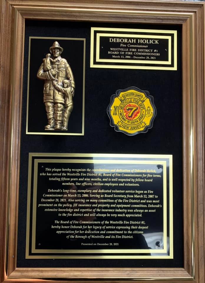 Chairman Marsden and the members of the Board of Fire Commissioners honored Retired Board Member Deborah Holick for her 15 years of service. Commissioner Holick served on many committees and as Board Secretary throughout her five terms. Thank you for your service to the Board of Fire Commissioners the Firefighters of the Westville Fire Department and to the Residents of the Borough of Westville!