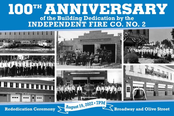 The Westville Fire Department announces the Rededication of the Independent Fire Company No. 2 at Broadway and Olive Street on the 100 Anniversary of the original dedication of the building on August 19, 1922.